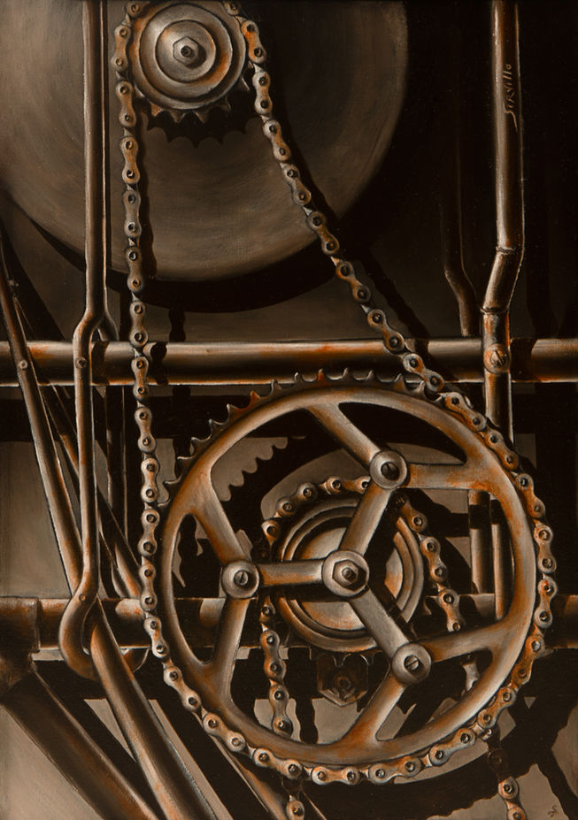 L’umano e il meccanico, il reale e il surreale, la tradizione e l’innovazione si intrecciano nell’arte di Antonio Servillo. Con una tecnica che spazia dall’iperrealismo al metafisico racconta storie e suggestioni con l’uso vibrante del colore e l’inserimento ricorrente di ingranaggi, simboli della connessione tra individuo e contemporaneità. Le sue opere, evocano emozioni profonde e riflessioni sul tempo, sulla società e sulla natura dell’esistenza. Ogni creazione è un universo ricco di dettagli, capace di coinvolgere lo spettatore, invitandolo a scoprire significati nascosti e a dialogare con il presente.